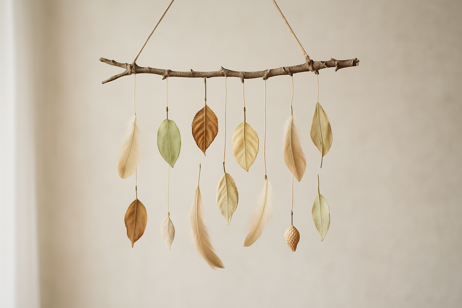 Используйте тонкие веточки как основу, подвесьте на них пёрышки, засушенные листья, лёгкие ракушки. Ветряная поделка будет красиво покачиваться от малейшего движения воздуха.