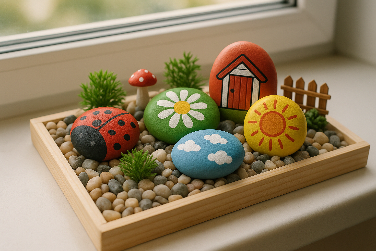 Выбирайте гладкие камни округлой формы, тщательно промывайте и просушивайте их. Акриловые краски лучше всего подходят для росписи, они яркие и не смываются водой. Создайте целое каменное семейство: животных или сказочных персонажей. Мини-садик с камушками станет отличным декором для подоконника или балкона. Изготовление таких поделок развивает аккуратность и терпение у детей.