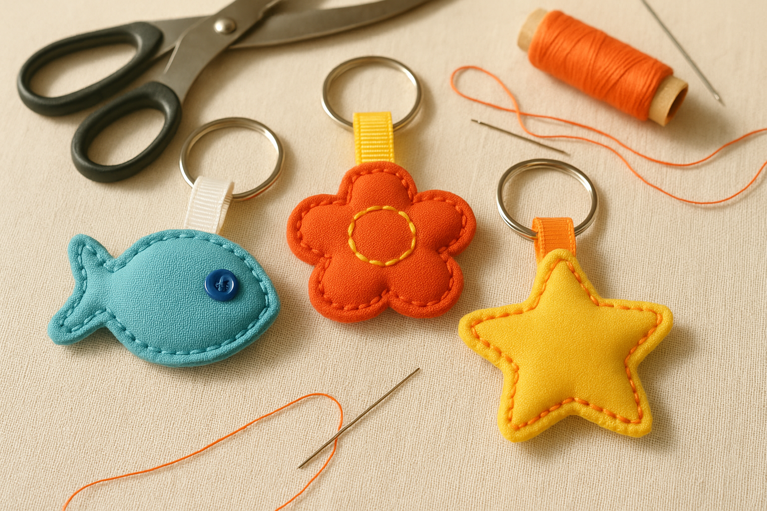 - Создайте простые брелоки из ткани — вырежьте формы рыбок, цветов или звёздочек, сшейте их простым швом. Наполните брелоки синтепоном или ватой для объёма. Работа с тканью и нитками развивает мелкую моторику и творческие способности.